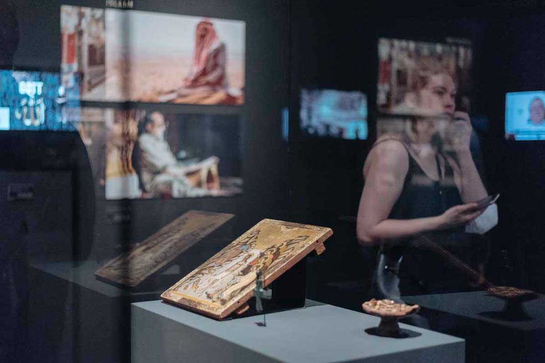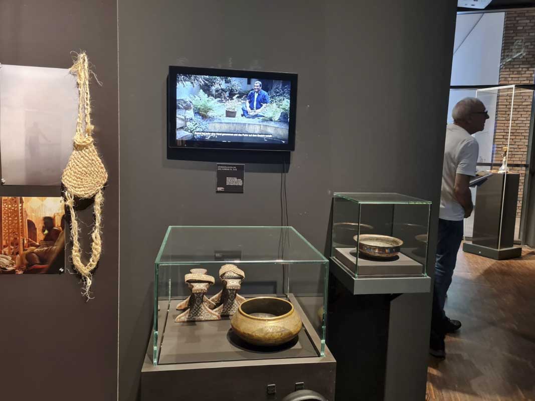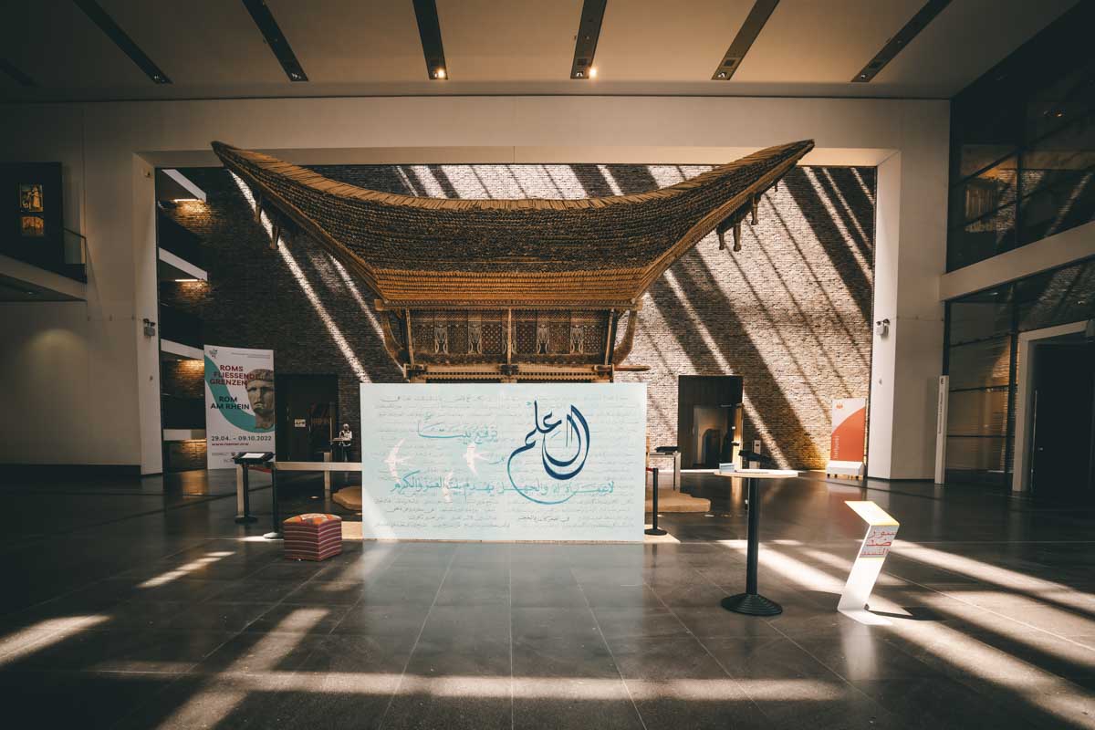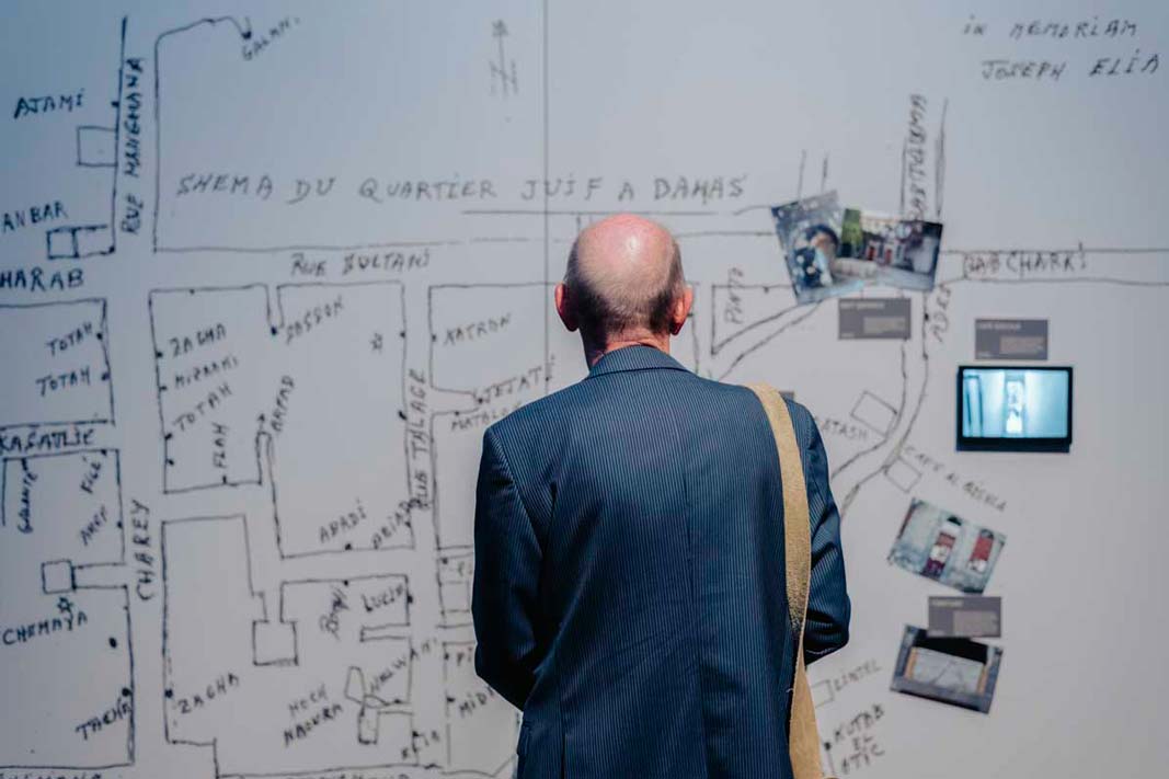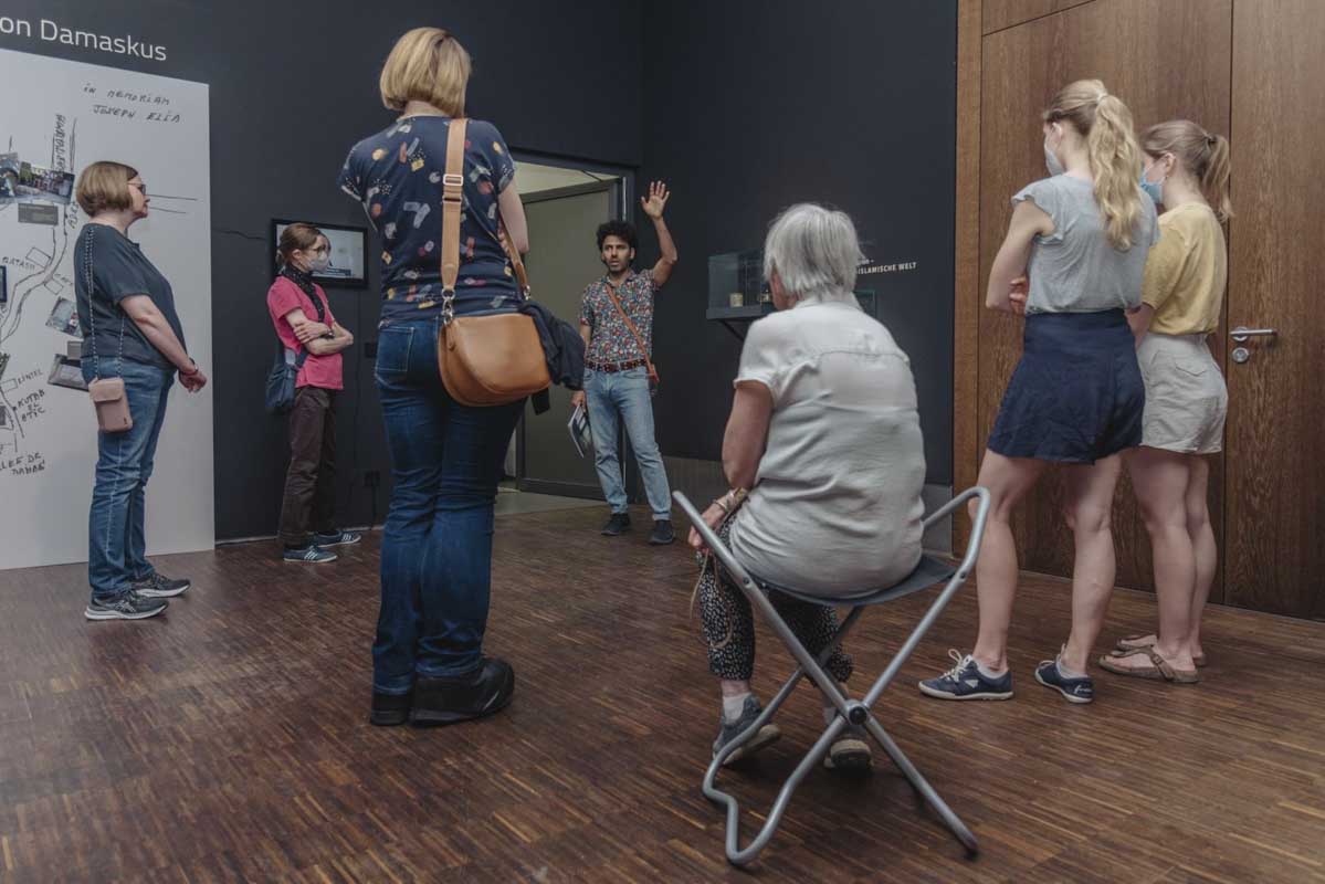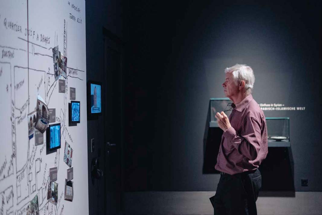 Mit der Ausstellung begibt sich Jabbar Abdullah auf die Spuren des kulturellen Gedächtnisses Syriens. Er zeigt historische, syrische Artefakte aus deutschen Sammlungen im Dialog mit zeitgenössischen Positionen und syrischer Alltags- und Erinnerungskultur. Entlang einer Zeitachse werden die Besucher*innen durch Zeugnisse frühester Menschheitsgeschichte u.a. aus den Höhlen von Yabroud geführt. Sie bekommen Einblicke in die Entwicklung von Städten und einen Eindruck von unterschiedlichen Zivilisationen, die in Syrien einst lebten. Ein zweiter Abschnitt der Ausstellung lädt ein in die Städte Aleppo, Damaskus und Raqqa, die die Besucher*innen als „Szenen“ erleben können. Kalligraphie, Filmmaterial und 3D-Projektionen beleuchten die kulturelle Vergangenheit Syriens und seine jüngste Geschichte insbesondere in diesen kulturellen Zentren.